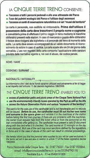 친퀘테레에는 리오마조레(Riomaggiore) - 몬테로쏘(Monterosso)간 사용할수 있는 편리한 카드가 있다.