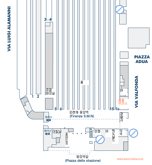 피렌체 중아역의 정확한 이름은「피렌체 산타 마리아 노벨라역(Santa Maria Novella)」으로 「Firenze S.M.N.」이라고 명기되어 있는 곳이 있다.